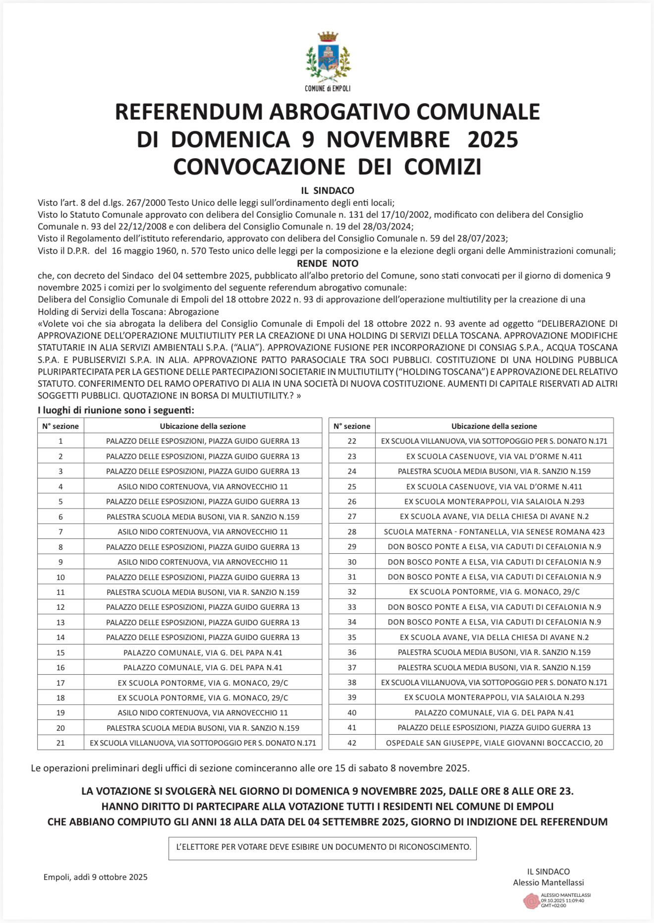 Il Comune di Empoli, dopo aver scelto di non votare a primavera ma nel mese più disagevole, novembre, spesso funestato da emergenze meteo, al primo referendum comunale abrogativo, e dopo aver negato l’accorpamento con le regionali nella speranza di evitare il raggiungimento del quorum, va fino in fondo nel boicottaggio del referendum chiesto da oltre 4.000 cittadini, scegliendo modalità di gestione minime consentite dalle norme.